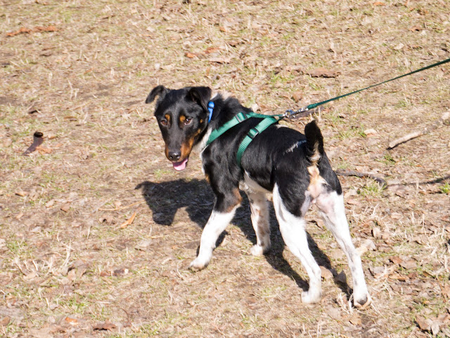 Szép, napsütéses, de azért még mindig kicsit csípős idő volt a mai sétánkon a Ligetben. Cupi nagy farkcsóválással szaladt elénk. Bénáztam nagyon a hámmal, meg volt csavarodva és nem tudtam rátenni. Ehhez képzeljünk el egy gumilabdaként pattogó kutyát (séta!séta!séta!sétálnimegyünk!!!), elég hozzá annyi, hogy Gábor kabátja eléggé kutyaszőrös lett a művelet végére. Kisült, hogy Cupidó felszedhetett újabb két dekát, ezért nem tudtam összekapcsolni a hámot, amit direkt szűkre hagytunk eddig is, nehogy séta közben kibújjon belőle.